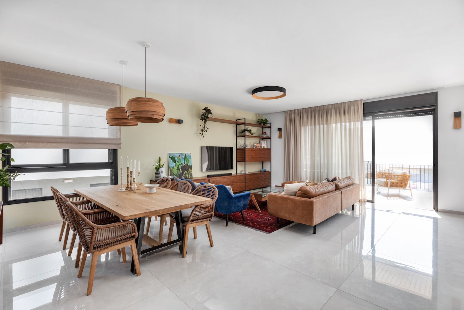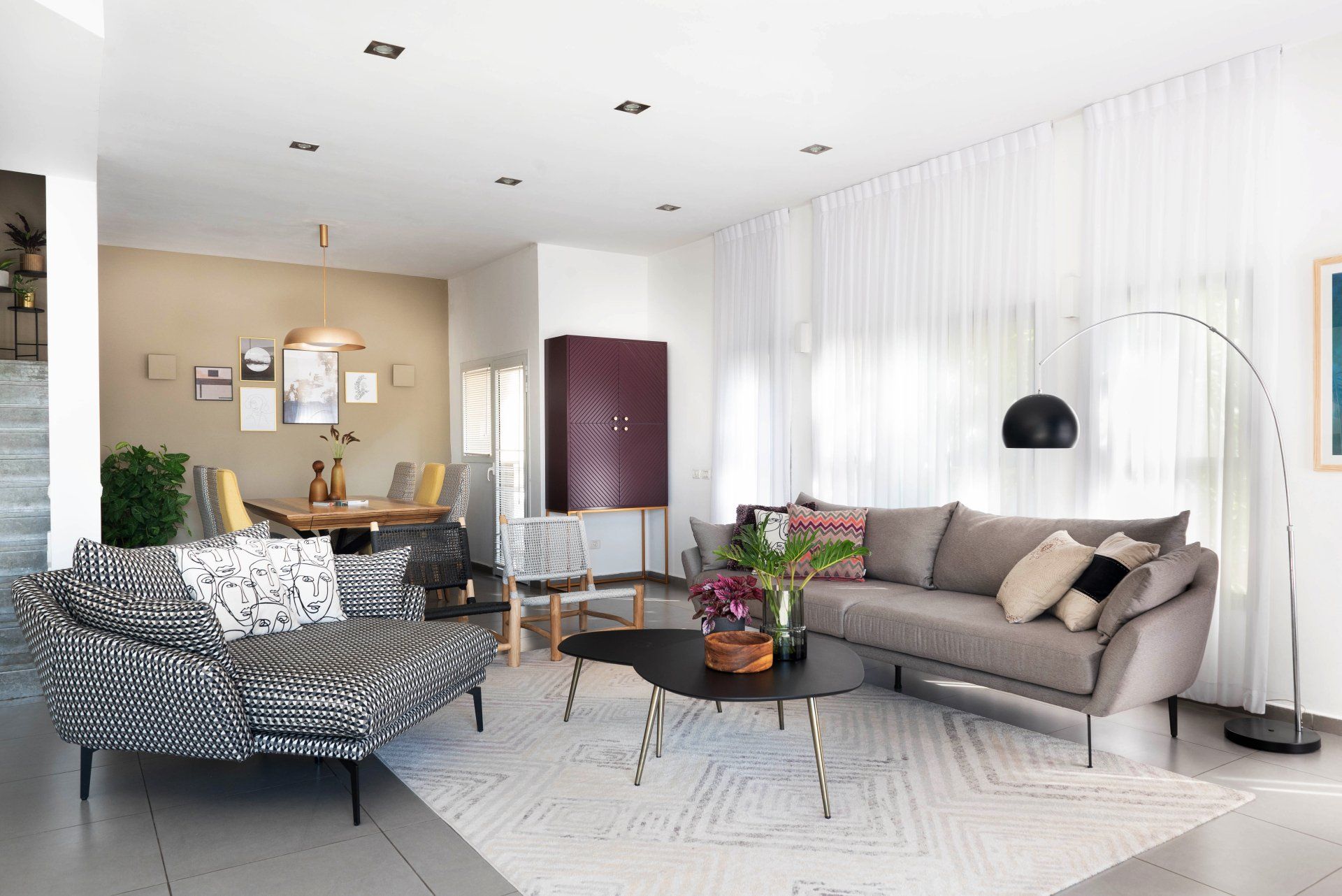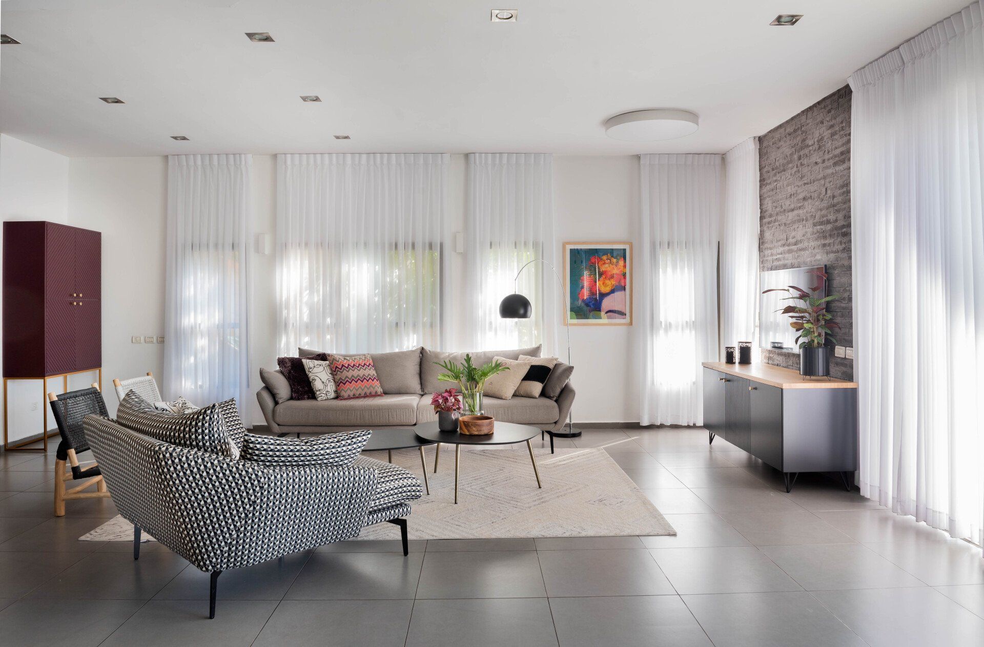 דירת חמישה חדרים בבניין בוטיק בפרדסיה שעברה הלבשה מלאה כולל ריהוט בהתאמה אישית, תאורה, טקסטיל ופרטי אמנות.